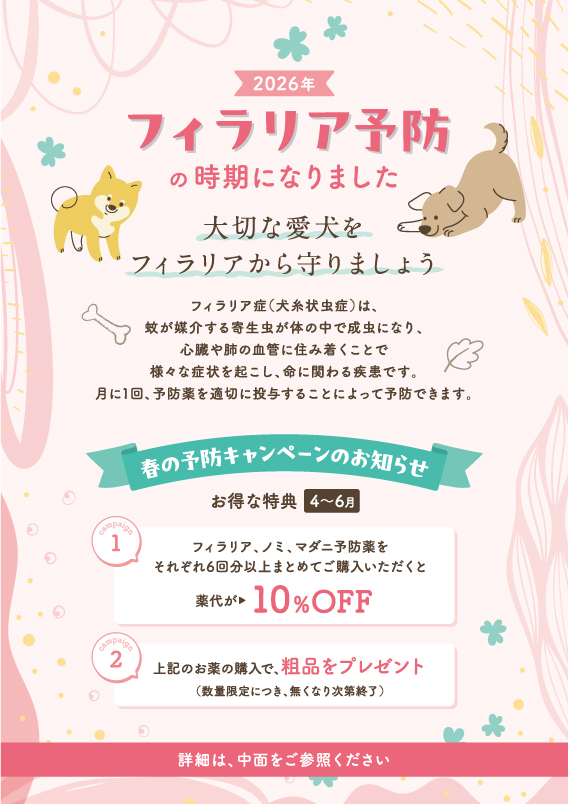 春は予防の来院が増えますので、平日・土曜の日中に、通常の診察時間を延長して診察を行います。